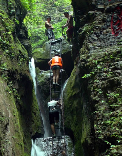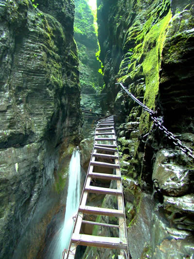 坐龍峽風(fēng)景區(qū) 坐龍峽擁有中國(guó)第一條特種游道。所有游道均建于峽谷深處,依山取勢(shì),既經(jīng)細(xì)心雕琢聽(tīng)卻又渾然天成。粗樸的板栗木棧道,可以讓你零距離的親近那一潭碧幽、聽(tīng)聞山泉叮咚;精巧的跳墩,可以讓你媳戲流泉、觸感溪瀑;原質(zhì)的石坎道,讓你不得不調(diào)動(dòng)全部的身心能量悉心攀援、感悟峽谷;有驚無(wú)險(xiǎn)的鐵梯,讓你伴著腳下轟鳴的溪水,在驚怵中體味一份快慰。出口處的土家山寨,保留了古樸獨(dú)特的生活習(xí)俗。一塊臘肉就一口醇香的“苞谷燒”會(huì)讓你洗去所有的疲憊,在輕松中憨厚的主人向你講述過(guò)去強(qiáng)人出沒(méi)的故事......