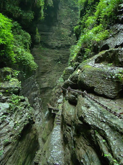 坐龍峽圖片 坐龍峽風(fēng)景區(qū)位于古丈縣河西鎮(zhèn),與“芙蓉鎮(zhèn)”--王村一水之隔。經(jīng)由300萬(wàn)年大自然的風(fēng)吹、水蝕而成,一直隱逸于湘西茫茫十萬(wàn)群山之中。它長(zhǎng)約3500米,最大高差達(dá)300余米;寬處不足丈余,窄處僅容一人通過(guò);谷內(nèi)絕壁縱疊,溪瀑橫懸,崖樹斜逸,異草遍坡。