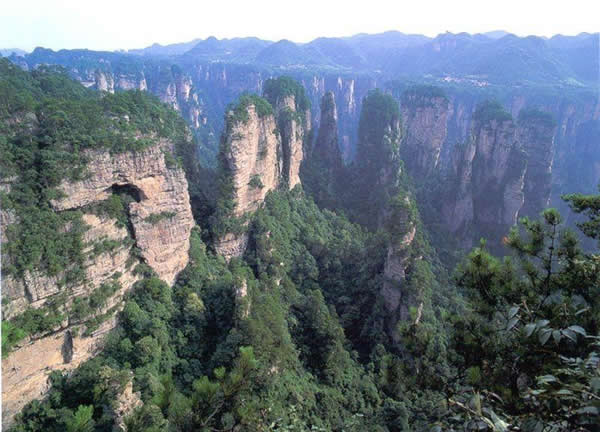 這就是大觀臺(tái)。極日遠(yuǎn)眺,千百座奇峰盡收眼底。一位詩(shī)人說(shuō),武陵源的砂巖石峰是一步一觀景,千步千造型,一山有四季,十步不同大。專家測(cè)算出武陵源石峰有3103座。一如一位高超的雕塑大師,模擬宇宙萬(wàn)物,無(wú)不形態(tài)逼真,維妙維肖,栩栩如生,呼之欲動(dòng)。有的如海螺出水,有的如金龜銜日,有的如蓮花盛開,有的如天橋橫空,有的如長(zhǎng)槍刺大,有的如寶塔聳立,有的如老人采藥,有的如玉女梳妝,有的如將軍出征,有的如戰(zhàn)馬長(zhǎng)嘯,有的如情人幽會(huì),有的如夫妻相擁,有的如仙女散花,有的如村姑守望……有的孤峰獨(dú)秀,有的直插云霄,有的婷婷玉立,有的威武勇猛,有的小巧玲瓏,有的大氣磅礴。進(jìn)入武陵源,但見一片峰的森林,峰的世界,峰的海洋。挺拔、奇秀、集中、原始、粗獷、古野。這就是武陵源。 一位藝術(shù)大師說(shuō):武陵源的山峰,改寫了山的概念。大攝影家陳勃說(shuō) :“三山五岳堪比美,華夏風(fēng)光第一流!蓖趵^杰先生說(shuō):“武陵源上二日游,勝讀千篇李杜詩(shī)!痹S世杰先生說(shuō):“秀幽險(xiǎn)峻稱奇絕,五岳黃山拜·卜風(fēng)!崩畛扇鹣壬鸀榇舜蟊Р黄剑骸吧裰輨倬罢l(shuí)為最?須請(qǐng)霞公重評(píng)勘!笨上煜伎蜔o(wú)緣到大觀臺(tái)來(lái),也不可能為武陵源作甚評(píng)價(jià)了。