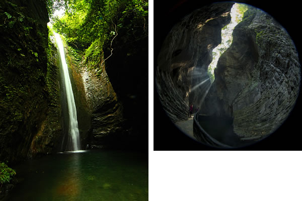 西線原名叫雪花溪,又叫雪花洞,水從懸崖上掉下來濺起水花,泉水與巖石相碰,落成大霧,形成雪花狀,故名雪花溪。因地勢險峻,歷代人都沒有把雪花溪走通過,從下往上看深不見底,古人以為是一個洞,故又叫雪花洞,其實(shí)是一個峽谷,有七潭七瀑,現(xiàn)在叫“仙女峽谷”。峽谷長800米,最窄處僅1米左右,上下落差近200米,因水的長期回旋沖刷, 巖層的堅(jiān)硬度各異,形成了底寬頂窄,時北,時西,時東,陰暗無光,形似溶洞, 泉水飛流直下,形成梯級瀑布,擊打在巖壁上濺起的水花猶如雪花飛舞,潭中一片雪白,古人稱之為雪花洞,峽谷中有七個各異的潭池在沖擊的水花中若隱若現(xiàn),故改稱為七仙女人間沐浴瑤池,從開天辟地起無人行通過,現(xiàn)在已修好的占道,于峽谷水花之中,幻入仙境之感。