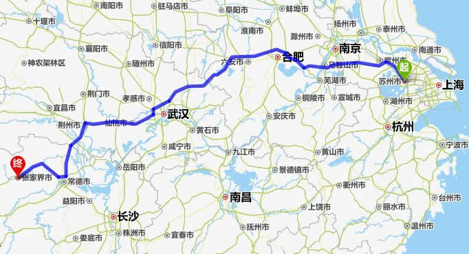 左右,沿途經過蘇州市——常州市——馬鞍山市——合肥——六安市——麻城市——仙桃市——潛江市——荊州市——常德市(這里可以不走常德,直接從荊州經澧縣、石門縣到慈利縣)——慈利縣——張家界。