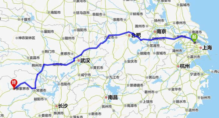 左右,沿途經過太倉——常州市——馬鞍山市——合肥——六安市——麻城市——仙桃市——潛江市——荊州市——常德市(這里可以不走常德,直接從荊州經澧縣、石門縣到慈利縣)——慈利縣——張家界。